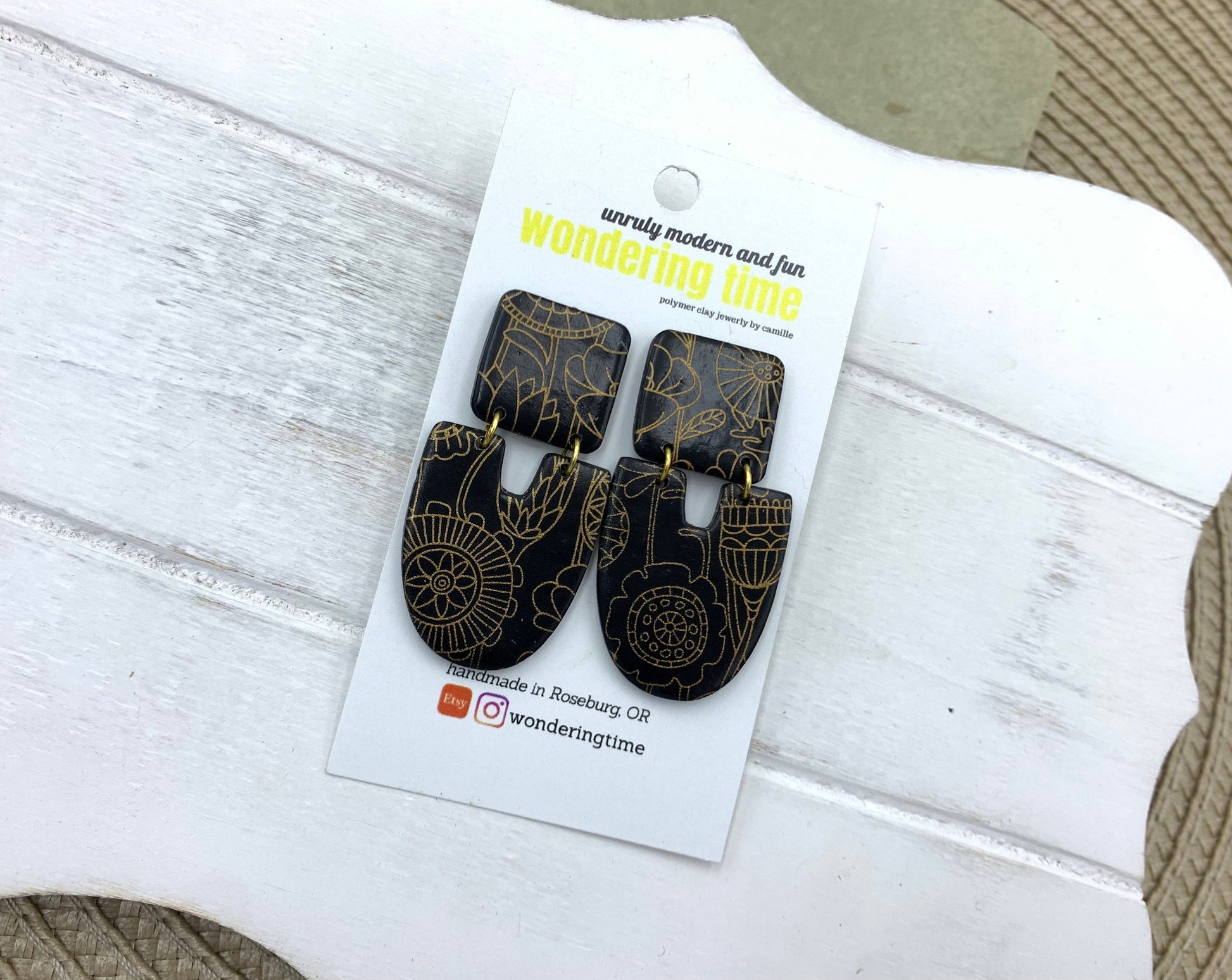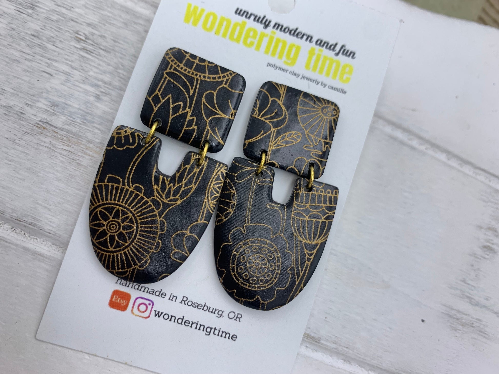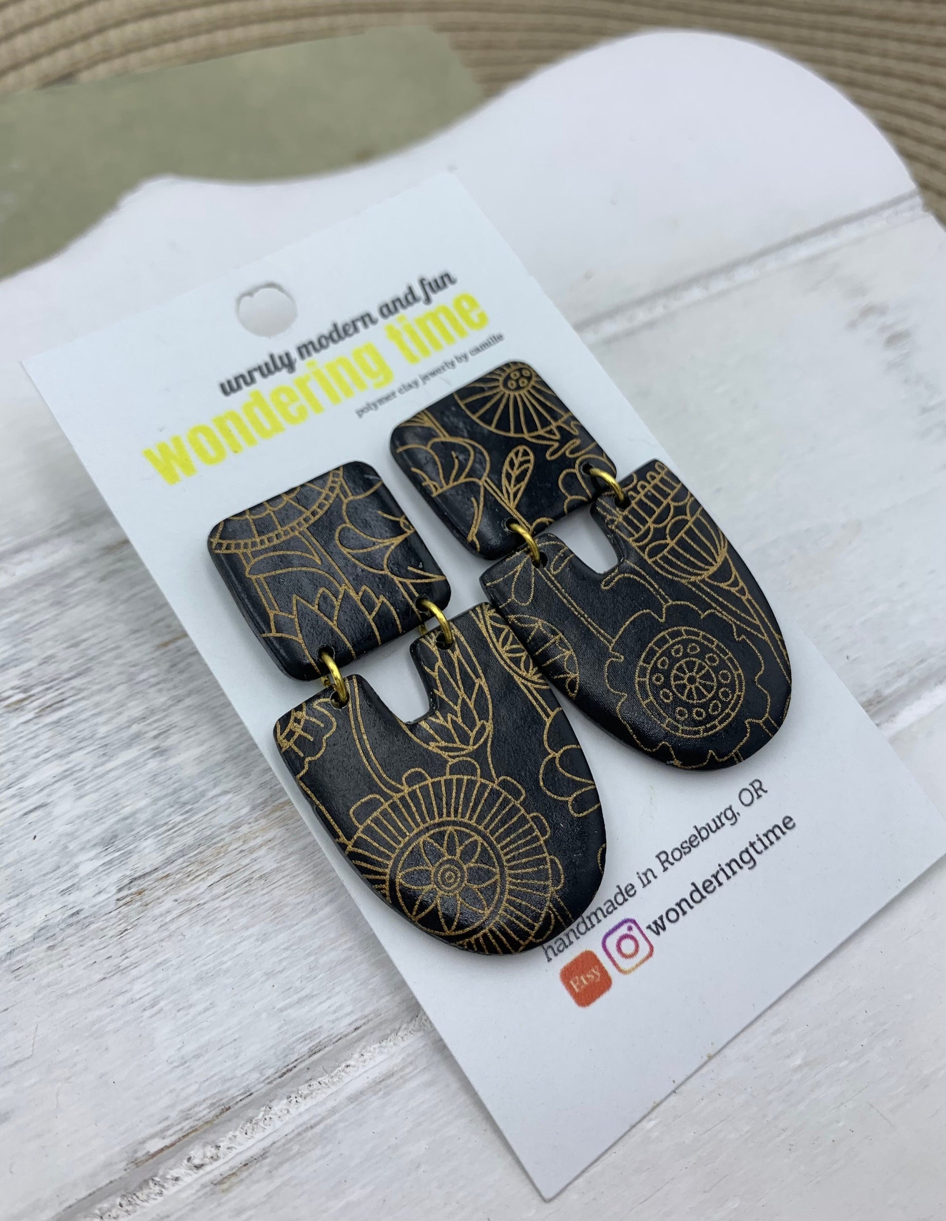Black Clay Dangle Earrings: Gold Floral Design, Lightweight