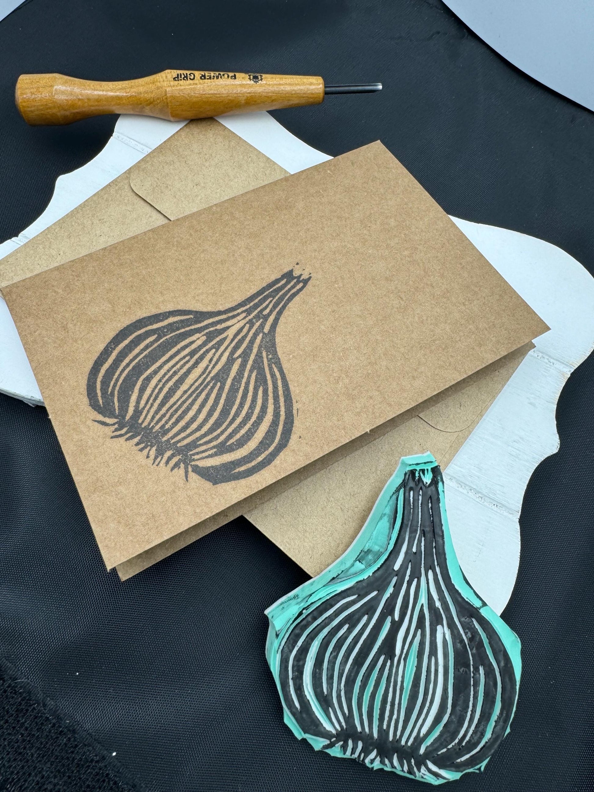 Calling all foodies! Gorgeous hand carved garlic card stamped with archival ink on 4x6” kraft notecard. Blank Interior.