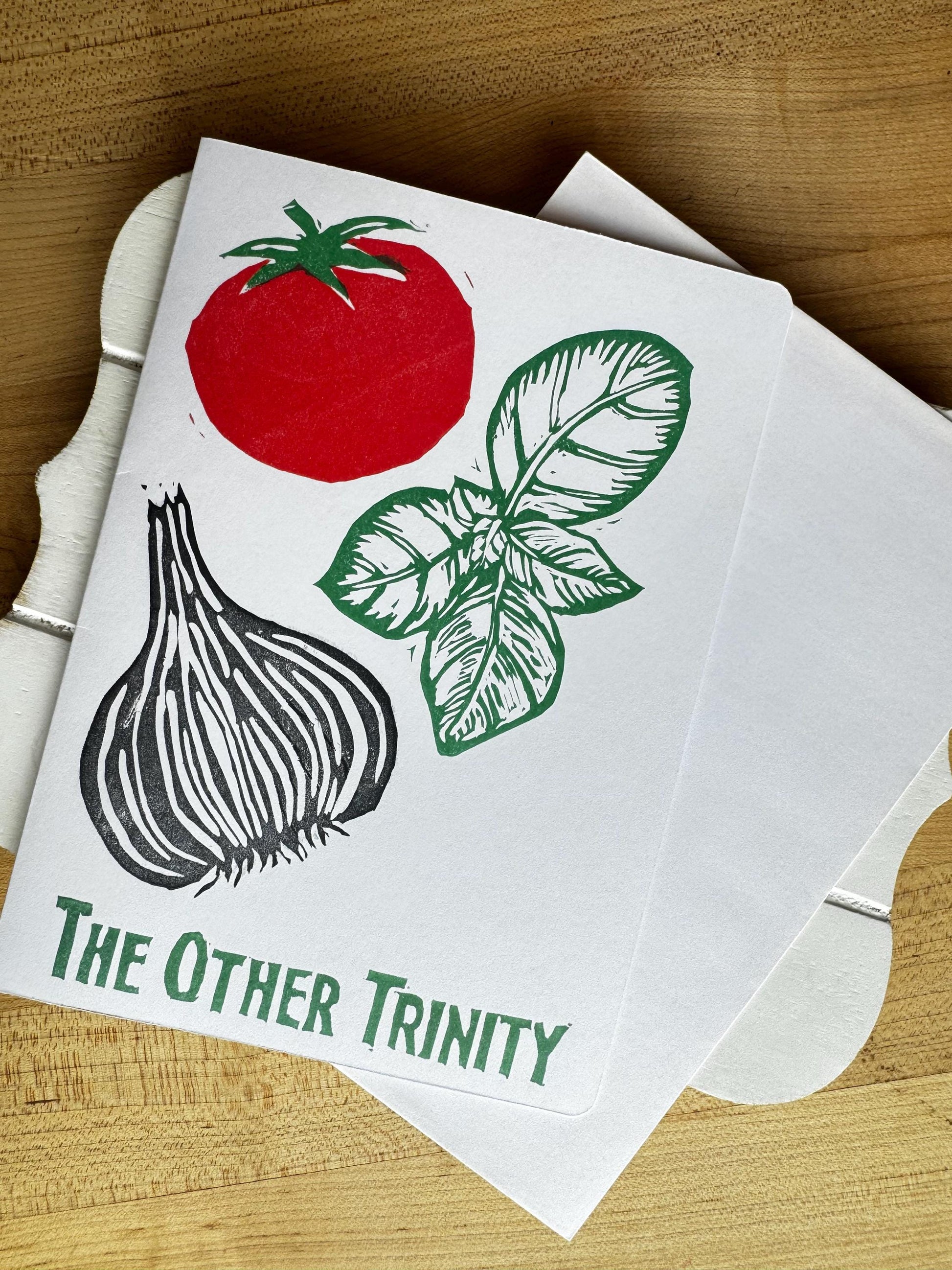 Celebrate the holy trinity of Italian cooking — tomato, garlic, and basil — with this vibrant hand-stamped card titled “The Other Trinity.”